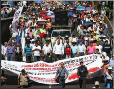 | MEXICO— Since the beginning of the year, tens of thousands of teachers from Chiapas, Oaxaca, Guerrero and throughout Mexico have marched and struck against the government's education reform. In Guerrero, 22,000 teachers are continuing a 55-day strike. They have militantly and massively blocked roads, broken into the state legislature, shut down schools and taken over radio stations. The teachers are valiantly fighting against the government's imposition of standardized tests on all students. The government will use the students' test results and the teachers' professional training to determine teachers' salaries, promotions or firing.